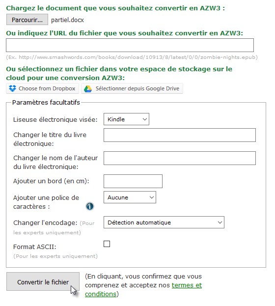 Choisissez un format de fichier : AZW par exemple. Une nouvelle page s’affiche. Cliquez sur le bouton Parcourir et désignez le fichier à convertir. Cliquez enfin sur Convertir le fichier et patientez jusqu’à ce que le fichier ait été converti :