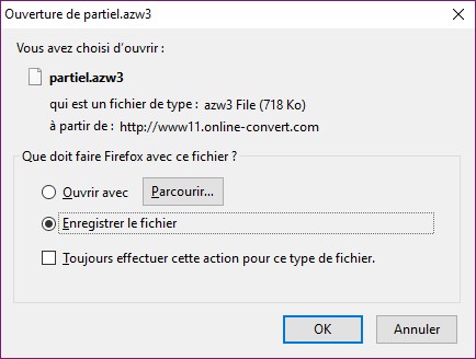 Une boîte de dialogue vous propose alors de sauvegarder le fichier converti. Validez en cliquant sur OK. Le fichier sera enregistré par défaut dans le dossier Téléchargements :