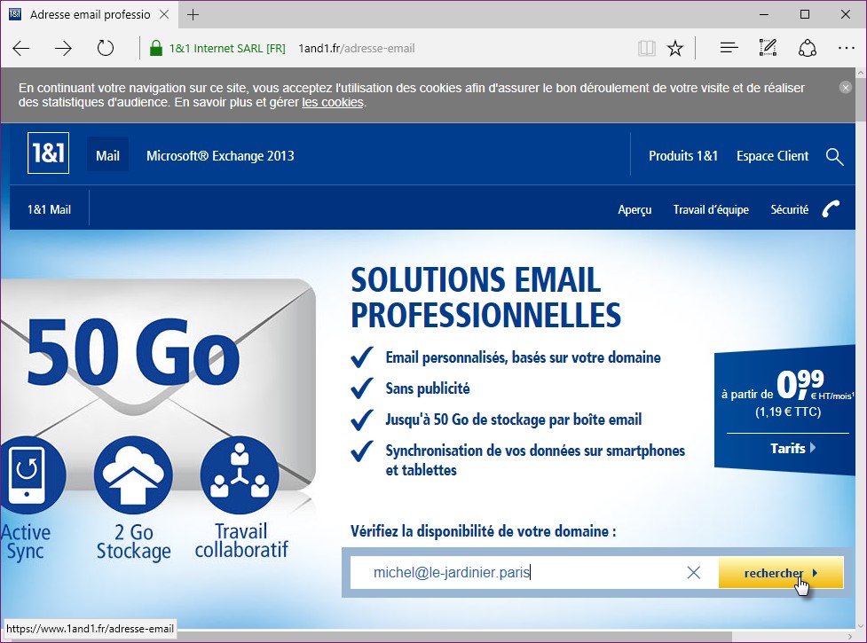 Pour avoir une adresse personnalisée, vous devez passer par un hébergeur de sites qui propose ce service. Par exemple, vous pouvez aller sur https://www.1and1.fr/adresse-email. Entrez l’adresse que vous voudriez avoir et cliquez sur Rechercher :