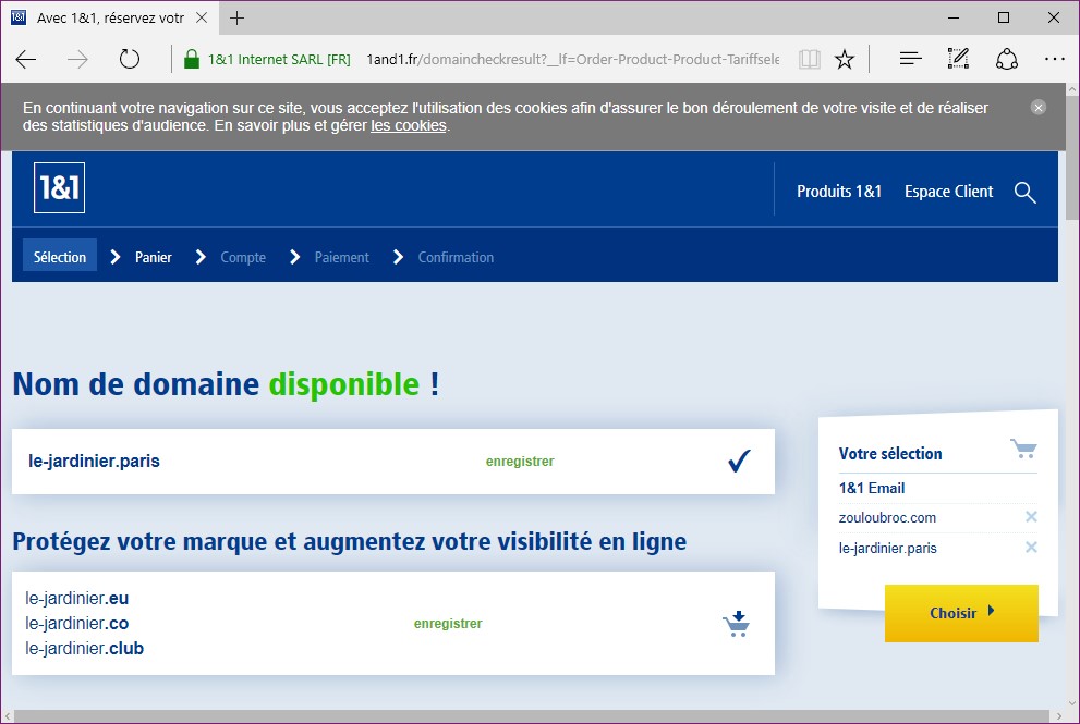 Une nouvelle page s’affiche. Si le nom de domaine est disponible, poursuivez l’enregistrement en suivant les consignes qui s’affichent :