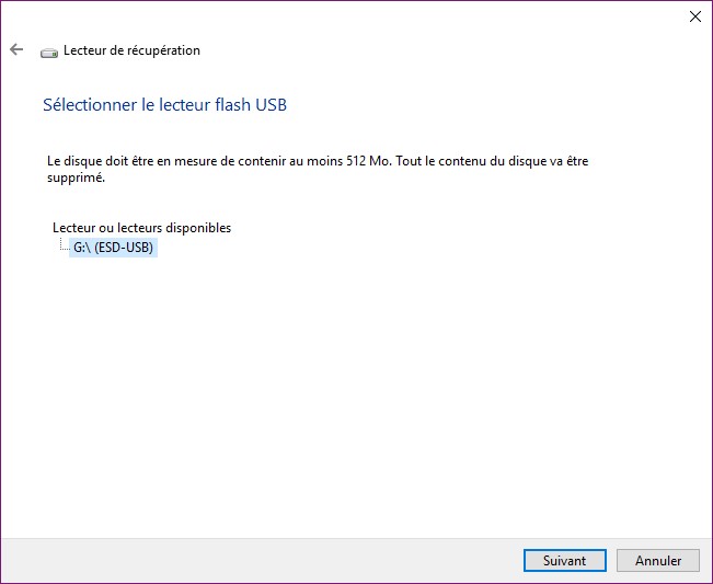 Munissez-vous d’une clé USB d’au minimum 4 Go et connectez-la à l’ordinateur. Attention, toutes les données de la clé seront effacées. Assurez-vous d’en faire une sauvegarde si la clé n’est pas vierge. Cliquez sur Suivant. Au bout de quelques secondes, une boîte de dialogue indique quels supports amovibles sont connectés sur votre ordinateur :
