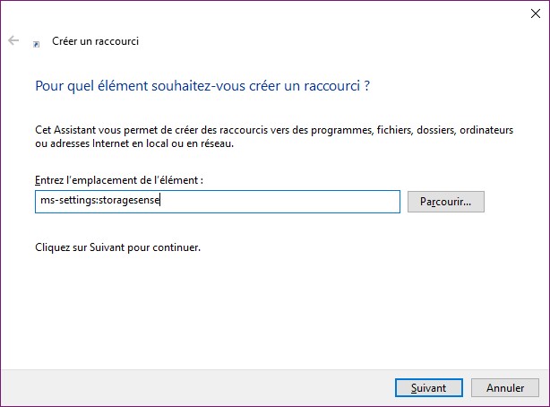 Pour créer une icône de raccourci vers une de ces boîtes de dialogue, cliquez du bouton droit sur une partie inoccupée du bureau, pointez Nouveau puis cliquez sur Raccourci. La boîte de dialogue Créer un raccourci s’affiche. Entrez la commande qui correspond au raccourci que vous voulez créer. Par exemple, pour accéder à la boîte de dialogue Stockage, tapez ceci :