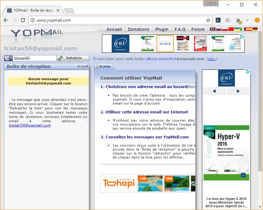 Sous Saisissez le mail jetable de votre choix, entrez la première partie de l’e-mail, c’est-à-dire ce qui précède @yopmail.com, puis cliquez sur Vérifier les mails. Ici par exemple, j’ai choisi l’adresse tristan56@yopmail.com en entrant tristan56 dans la zone de texte. Tous les messages reçus sur cette adresse sont immédiatement affichés dans le navigateur :