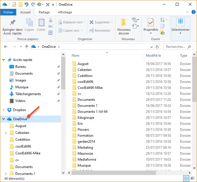 Le dossier OneDrive s’affiche par défaut dans le volet gauche de l’Explorateur de fichiers :