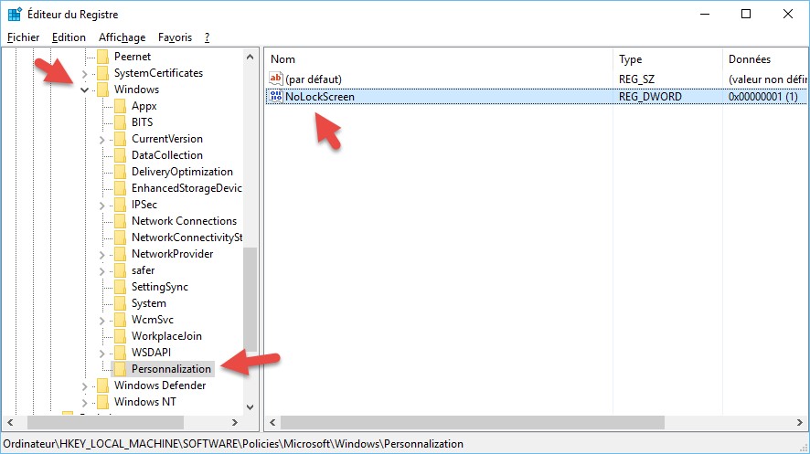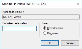 Cliquez sur Démarrer, tapez regedit et cliquez sur regedit dans la partie supérieure du menu. Développez tour à tour les dossiers suivants dans le volet gauche de l’Editeur du Registre : HKEY_LOCAL_MACHINE, SOFTWARE, Policies, puis Microsoft. Cliquez sur Windows. Si la clé Personnalization n’existe pas sous Windows, lancez la commande Nouveau/Clé dans le menu Edition. Tapez Personnalization et appuyez sur Entrée. Lancez la commande Nouveau/Valeur DWORD 32 bits dans le menu Edition. Donnez la valeur NoLockScreen à la nouvelle valeur.