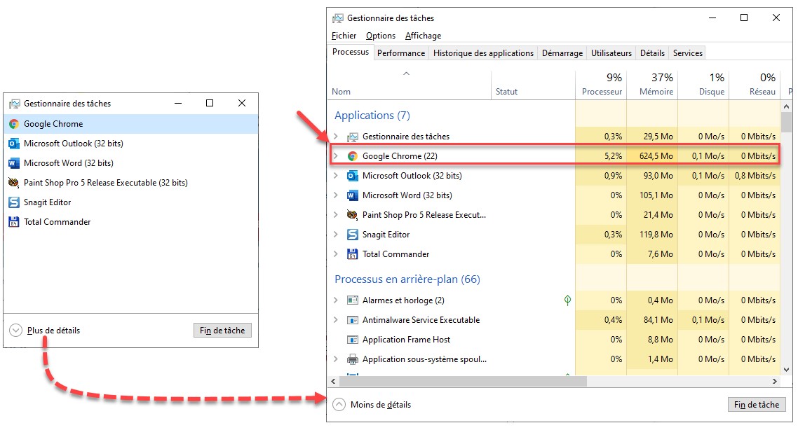 Pour savoir quelle est l’occupation mémoire de Chrome, lancez cette application, puis appuyez simultanément sur les touches Contrôle, Majuscule et Echap du clavier. Cette action provoque l’affichage du gestionnaire des tâches. S’il s’affiche en version réduite, cliquez sur Plus de détails. Comme vous pouvez le voir, l’espace mémoire occupé par Google Chrome est assez conséquent :