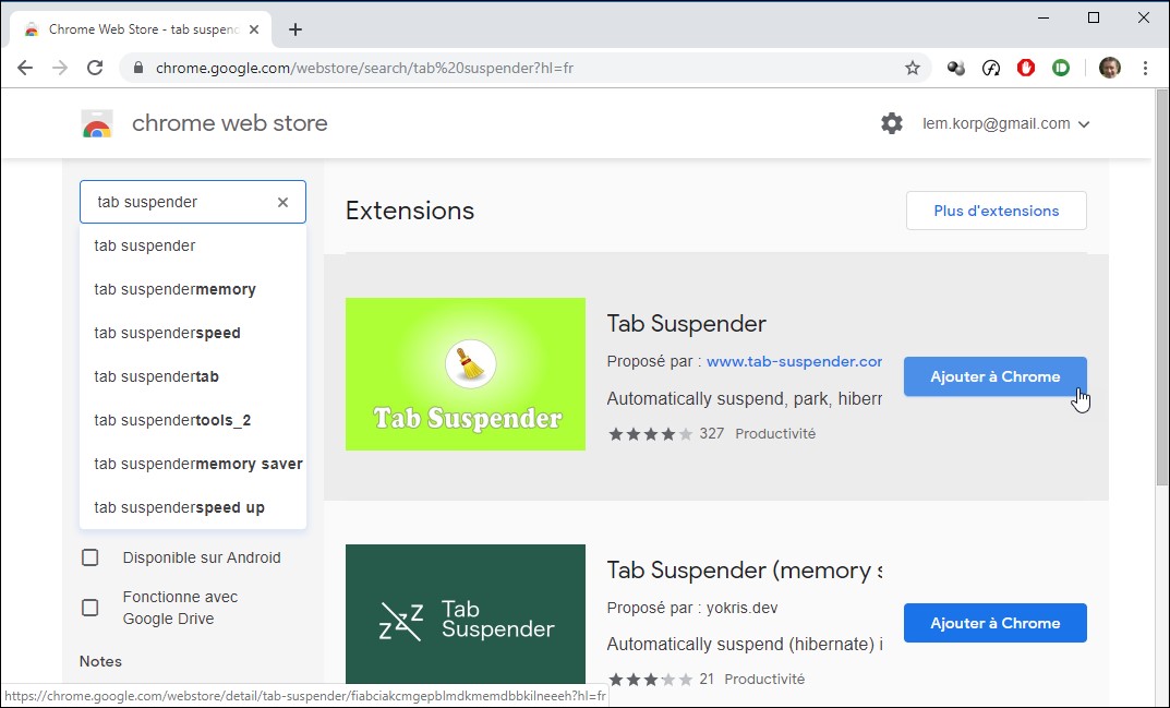 Rendez-vous sur la page Chrome Web Store. Tapez tab suspender dans la zone de texte de recherche puis appuyez sur la touche Entrée du clavier. L’extension Tab Suspender est à portée de souris. Cliquez sur Ajouter à Chrome :