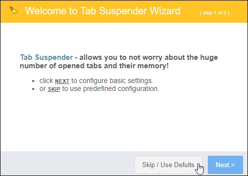 Cliquez sur Ajouter l’extension. L’Assistant d’installation s’affiche. Cliquez sur Skip / Use Defaults :