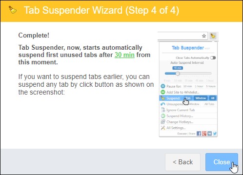 L’Assistant vous informe que les onglets inutilisés seront automatiquement suspendus dans 30 minutes. Cliquez sur Close :