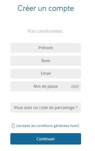 Remplissez le formulaire, acceptez les conditions générales hubiC et cliquez sur Continuer :