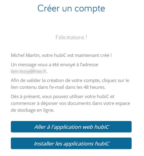 Quelques instants plus tard, un message vous indique que votre compte hubiC a été créé. Un e-mail de confirmation est envoyé à l’adresse que vous avez indiquée. Cliquez sur le lien contenu dans cet e-mail pour activer votre compte. Vous pouvez maintenant aller sur l’application Web hubiC ou installer l’application hubiC sur vos ordinateurs, téléphones et/ou tablettes.