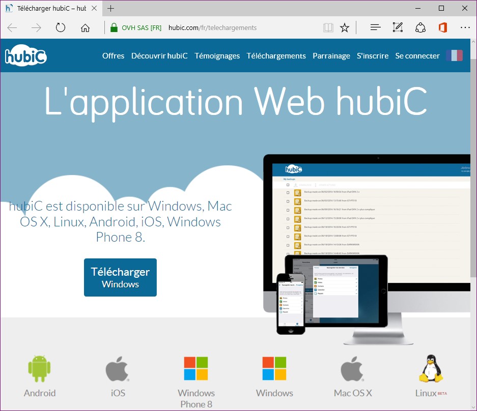 Si vous cliquez sur Installer les applications hubiC, vous atterrissez sur une page qui vous propose d’installer l’application hubiC sur Windows, Mac OS X, Linux, Android, iOS ou Windows Phone 8. Ici, le navigateur détecte qu’il s’exécute sur un ordinateur Windows. Il suffit donc de cliquer sur Télécharger Windows pour télécharger l’application hubiC :