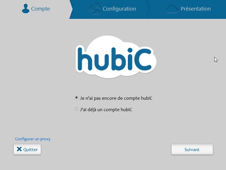 Lorsque vous lancez l’application hubiC pour la première fois, un message vous invite à configurer votre compte :