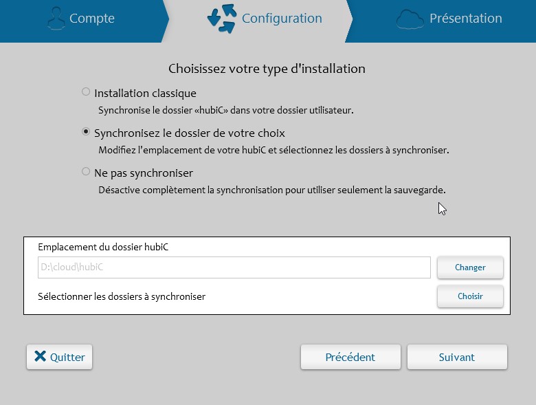 Faites votre choix et cliquez sur Suivant. Ici par exemple, les fichiers de hubiC seront stockés dans le dossier d:\cloud\hubiC :
