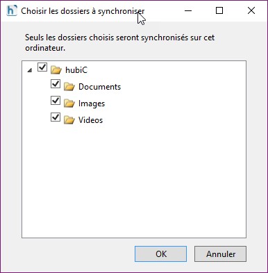 Par défaut, tous les dossiers de l’espace en ligne hubiC seront synchronisés sur votre ordinateur/tablette/téléphone. Si nécessaire, vous pouvez limiter la synchronisation à un ou plusieurs dossiers. Cliquez sur Choisir et faites votre choix dans la boîte de dialogue en ne cochant que les cases qui correspondent aux dossiers que vous voulez synchroniser :