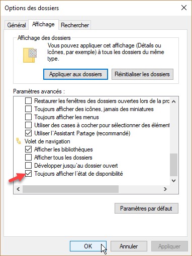 Vous aimeriez connaitre l’état de disponibilité des fichiers et dossiers stockés dans votre espace OneDrive ? Rien de plus simple : ouvrez le navigateur de fichiers, basculez sur l’onglet Affichage, puis cliquez sur l’icône Options, à l’extrême droite du ruban. La boîte de dialogue Options des dossiers s’affiche. Basculez sur l’onglet Affichage. Affichez les dernières entrées sous Paramètres avancés, cochez la case Toujours afficher l’état de disponibilité et validez en cliquant sur OK :