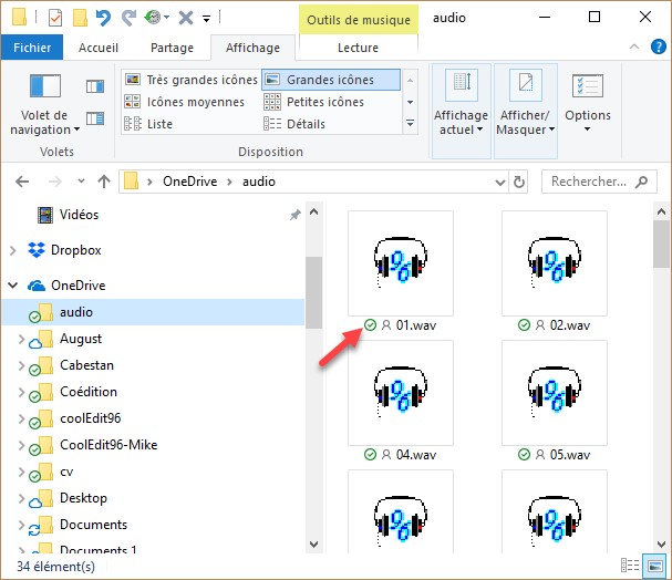 Quant aux fichiers, une icône indique leur disponibilité avant ou après leur nom (selon le type d’affichage) :