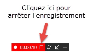 Si nécessaire, cochez la case Enregistrer avec le microphone, puis cliquez sur Démarrer l’enregistrement. L’enregistrement commence immédiatement. Il se limite à ce qui se passe dans la fenêtre capturée. Pour y mettre fin, cliquez sur l’icône Arrêter dans la barre qui s’affiche en haut et à droite de la fenêtre de l’application :