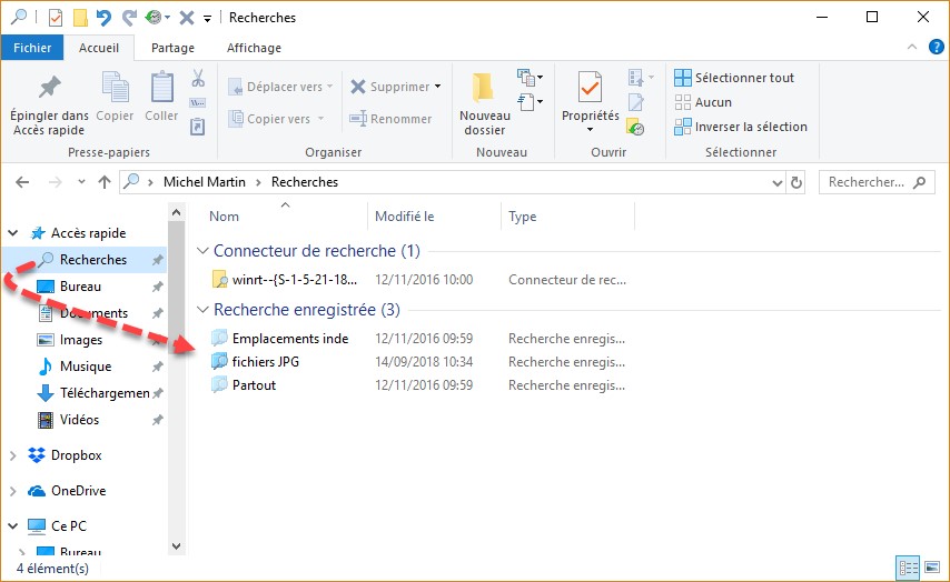 Le dossier Recherches (entre autres) s’affiche dans le navigateur. Pointez-le, maintenez le bouton gauche de la souris enfoncé et déposez-le dans le volet gauche, sous Accès rapide. Il vous suffit maintenant de cliquer sur l’entrée Recherches pour accéder à toutes les recherches que vous avez enregistrées :
