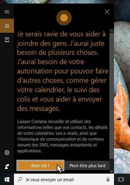Dites « Hey Cortana, je veux envoyer un e-mail ». Si vous n’avez jamais fait cela auparavant, Cortana vous demande votre autorisation. Cliquez sur Bien sûr.