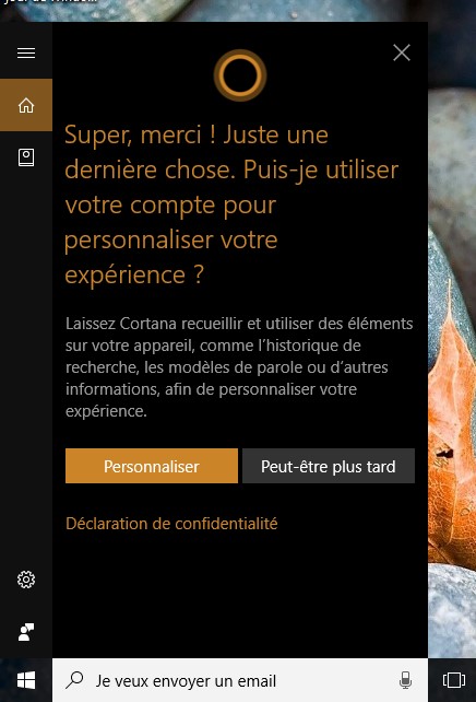Cortana vous demande alors si elle peut utiliser votre compte pour personnaliser votre expérience. Cliquez sur Peut-être plus tard :