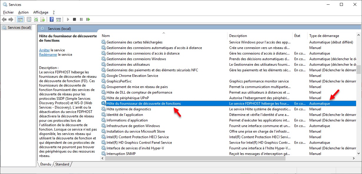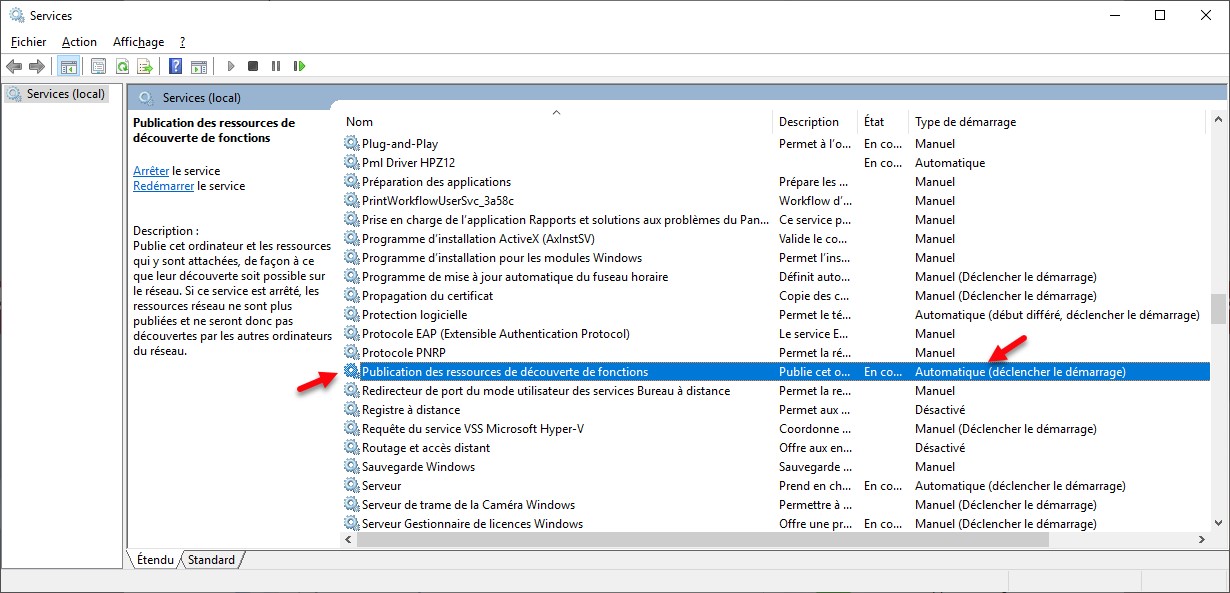 Cliquez sur Démarrer, tapez services et cliquez sur Services, dans la partie supérieure du menu Démarrer. L’application Services se lance. Elle liste les services Windows et leur état. Assurez-vous que le texte Automatique apparait dans la colonne Type de démarrage des services Hôte du fournisseur de découverte de fonctions et Publication des ressources de découverte de fonctions.