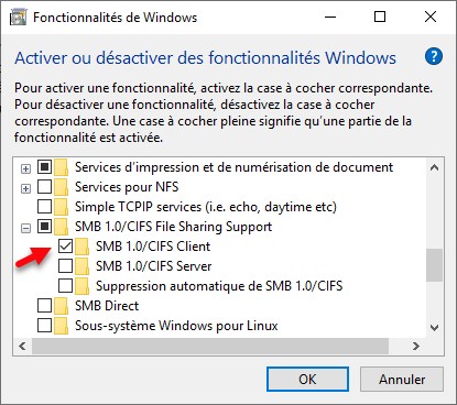 Cliquez sur Démarrer, tapez fonctionnalités windows et cliquez sur Activer ou désactiver des fonctionnalités Windows dans la partie supérieure du menu Démarrer. La boîte de dialogue Fonctionnalités Windows s’affiche. Déplacez-vous dans la liste alphabétique et assurez-vous que la case SMB 1.0/CIFS Client est cochée et que les autres cases en rapport avec SMB sont décochées :