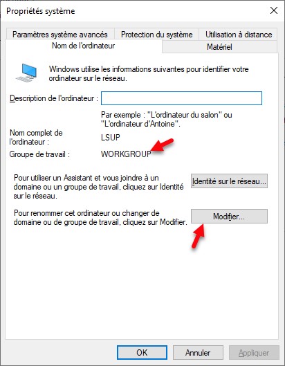 Appuyez simultanément sur les touches Windows et Pause du clavier. La boîte de dialogue Système s’affiche. Dans le volet gauche, cliquez sur Paramètres système avancés. La boîte de dialogue Propriétés système s’affiche. Sélectionnez l’onglet Nom de l’ordinateur. Assurez-vous que tous les ordinateurs sont connectés au même groupe de travail (WORKGROUP par défaut sous Windows 10). Et, si nécessaire, cliquez sur Modifier pour choisir un nom caractéristique de chaque ordinateur :
