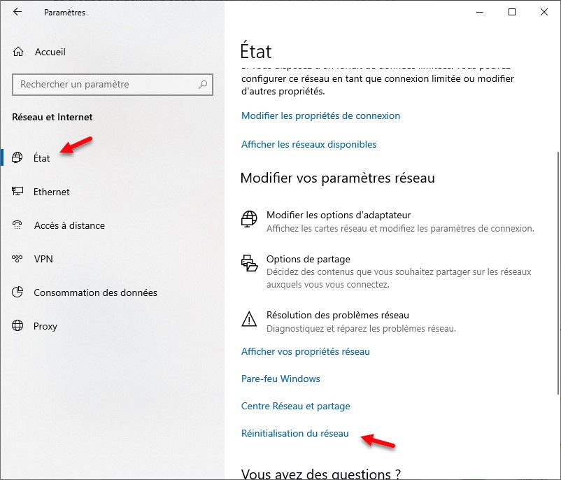 Cliquez sur Démarrer puis sur Paramètres. Dans la fenêtre Paramètres Windows, cliquez sur Réseau et Internet. Dans la nouvelle fenêtre qui s’affiche, l’onglet Etat doit être sélectionné dans le volet gauche. Déplacez-vous tout en bas du volet droit et cliquez sur Réinitialisation du réseau :