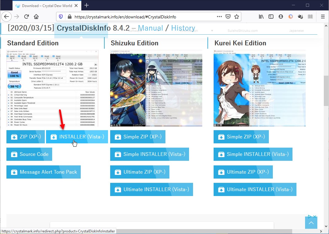 Ouvrez votre navigateur Web. Rendez-vous sur la page https://crystalmark.info/en/download/#CrystalDiskInfo. Sous Standard Edition, cliquez sur le bouton INSTALLER pour télécharger la dernière version de CrystalDiskInfo :