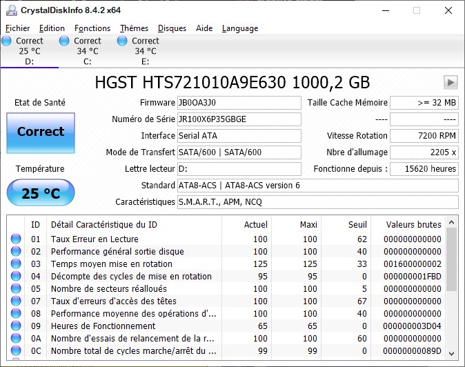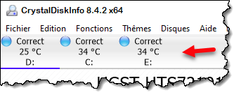 Ici, l’ordinateur est équipé de trois disques/SSD. Dans la partie supérieure apparaissent leur statut et leur température :