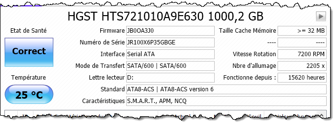 La partie centrale de la fenêtre affiche l’état de santé (correct, prudence ou critique), la température et les caractéristiques du disque sélectionné. Entre autres, le mode de transfert des données, la vitesse de rotation (pour un disque dur), le nombre d’allumages et le nombre d’heures de fonctionnement :