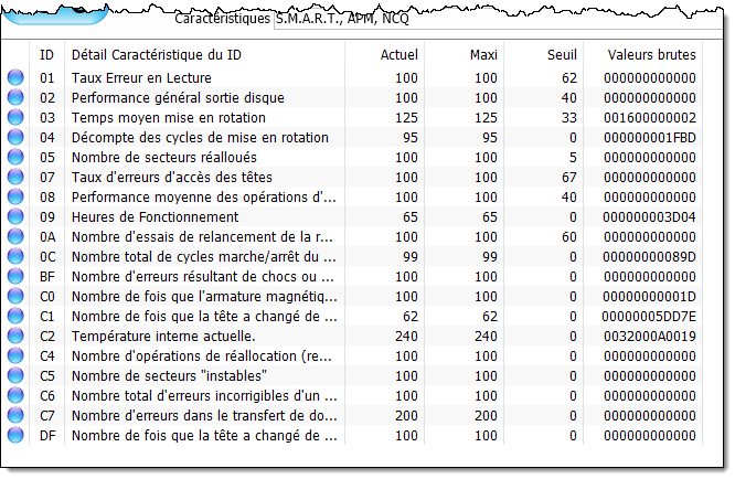 Les éléments précédés d’une puce bleue sont corrects. La puce devient orange si la valeur SMART laisse supposer une défaillance prochaine. Elle devient rouge si la valeur SMART laisse supposer une défaillance imminente.