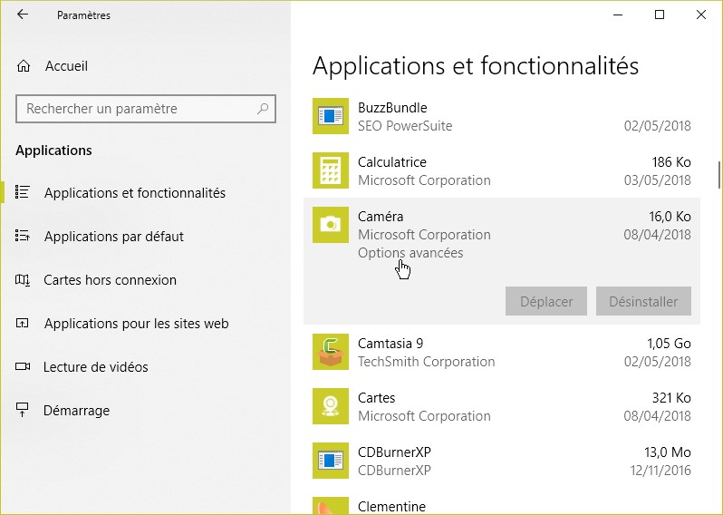 Les applications téléchargées dans le Microsoft Store peuvent être paramétrées dans la fenêtre Applications et fonctionnalités. Pour y accéder, cliquez sur Démarrer puis sur Paramètres. Dans la fenêtre Paramètres Windows, cliquez sur Applications. Cliquez alors sur l’application du store concernée :