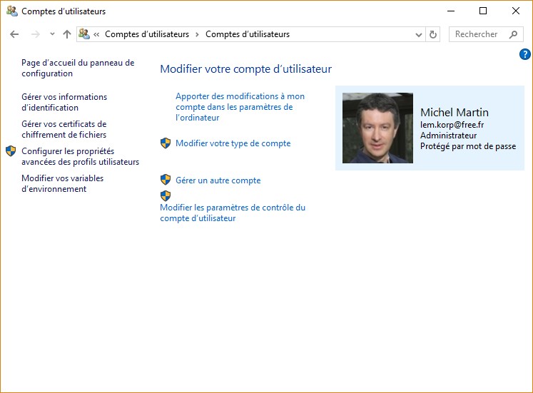 Si vous lisez jusqu’au bout, vous voyez que Windows 10 doit disposer d’un compte administrateur. Etant donné que mon compte est le seul sur cet ordinateur, je dois en créer un autre pour pouvoir transformer mon compte actuel en un compte standard.