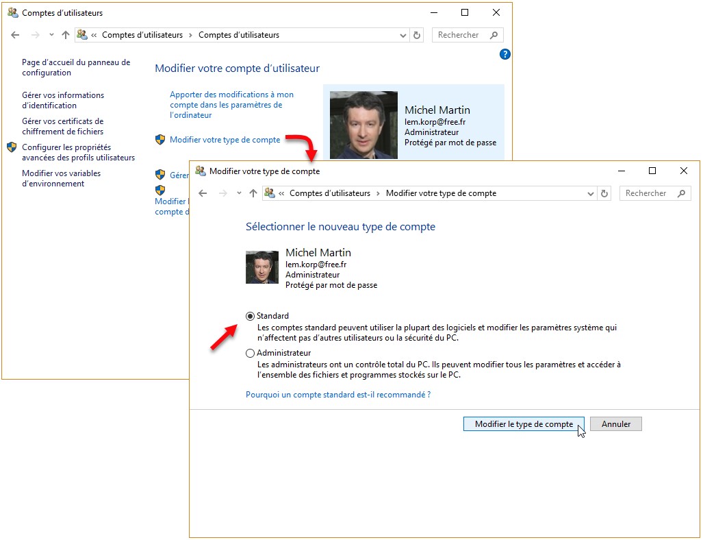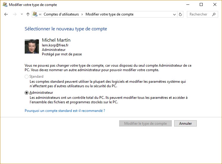 Il est donc maintenant possible de transformer mon compte administrateur en un compte de simple utilisateur. Dans la boîte de dialogue Comptes d’utilisateurs, un clic sur Modifier votre type de compte me permet de transformer le compte administrateur en un compte standard :