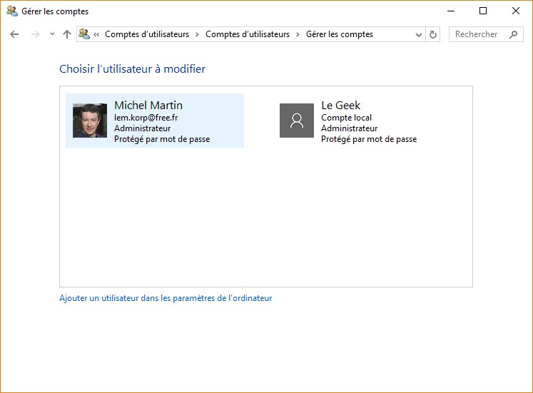 Ces bonnes pratiques rappelées, venons-en au fait : comment créer un compte standard ou administrateur comme vous le faisiez sous Windows 7 ? Ou encore, comment changer le compte administrateur qui a été créé lorsque vous avez installé Windows 10 en un compte de simple utilisateur ?