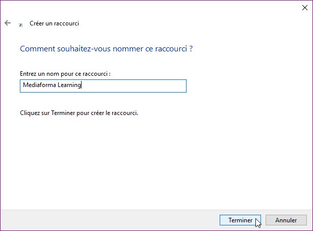 Cliquez du bouton droit sur un emplacement inoccupé du bureau, pointez Nouveau et cliquez sur Raccourci. La boîte de dialogue Créer un raccourci s’affiche. Supposons que vous vouliez ouvrir le navigateur Microsoft Edge sur le site https://www.mediaforma.com. Tapez microsoft-edge:https://www.mediaforma.com puis cliquez sur Suivant :