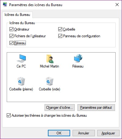 Si, par la suite, vous voulez cacher certaines de ces icônes système, il vous suffira d’afficher la boîte de dialogue Paramètres des icônes du bureau, de décocher les cases correspondantes dans le groupe d’options Icônes du Bureau et de valider en cliquant sur OK.