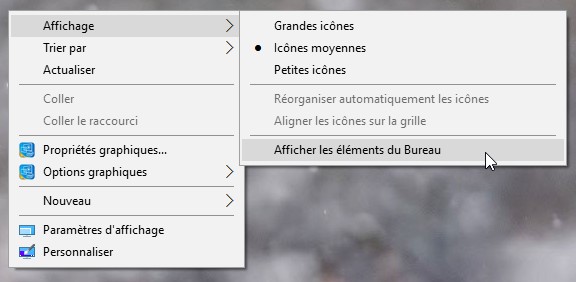 Je voudrais maintenant aborder un deuxième problème qui arrive parfois : la disparition pure et simple de toutes les icônes du bureau de Windows 10. Pas seulement des icônes système, mais également de toutes les icônes de raccourci qui ont été créées par vous-même ou par les applications que vous avez installées.