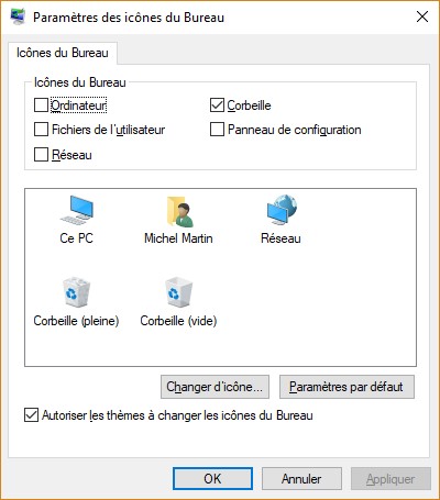 Cliquez du bouton droit sur une partie inoccupée du bureau et sélectionnez Personnaliser dans le menu. La fenêtre Paramètres s’affiche, onglet Arrière-plan sélectionné. Basculez sur l’onglet Thèmes et cliquez sur Paramètres des icônes du Bureau, dans l’angle supérieur droit de la fenêtre. La boîte de dialogue Paramètres des icônes du Bureau s’affiche :