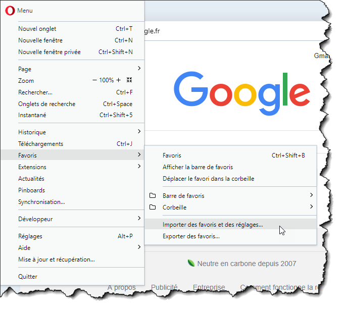 Une fois les favoris exportés, ouvrez Opera, cliquez sur l’icône Opera dans l’angle supérieur gauche de la fenêtre, pointez l’entrée Favoris et cliquez sur Importer des favoris et des réglages :