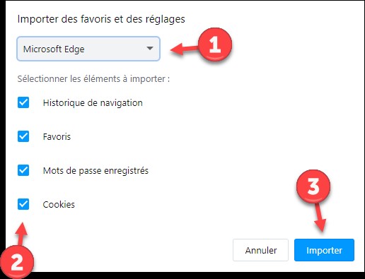 Une boîte de dialogue s’affiche. Sélectionnez le navigateur depuis lequel doit se faire l’importation (1), les éléments à importer (2), puis cliquez sur Importer (3) :