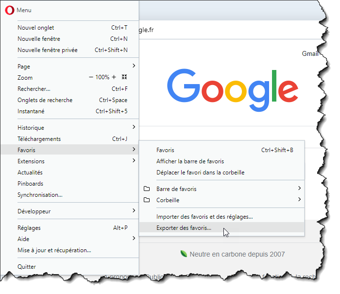 Supposons maintenant que vous vouliez exporter les favoris Opera pour les utiliser dans un autre navigateur. Cliquez sur l’icône Opera dans l’angle supérieur gauche de la fenêtre, pointez l’entrée Favoris et cliquez sur Exporter des favoris :