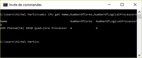 wmic CPU get Name,NumberOfCores,NumberOfLogicalProcessors