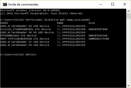 wmic diskdrive get name,size,model