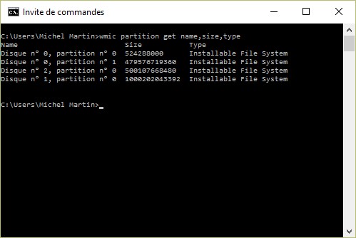 Nom, taille et type des partitions des mémoires de masse de l’ordinateur