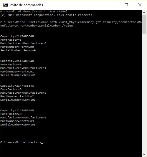 wmic path Win32_PhysicalMemory get Capacity,FormFactor,Manufacturer,PartNumber,SerialNumber /value