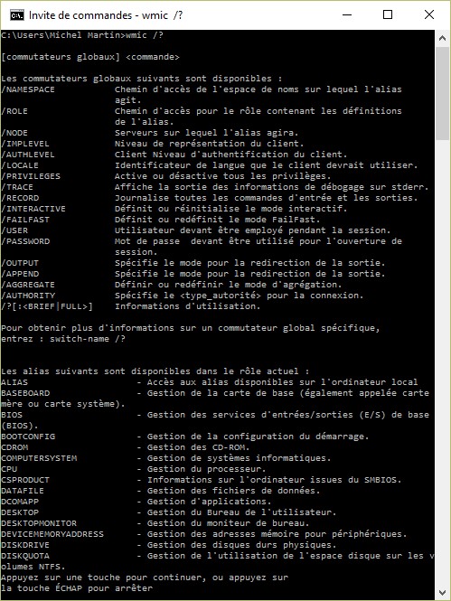 Vous obtiendrez un fichier texte dans le dossier c:\data qui liste toutes les possibilités de la commande wmic :