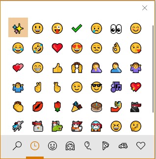 Basculez sur l’application dans laquelle vous voulez insérer un émoticône, puis appuyez simultanément sur les touches Windows et . du clavier. Une boîte de dialogue s’affiche en avant-plan :
